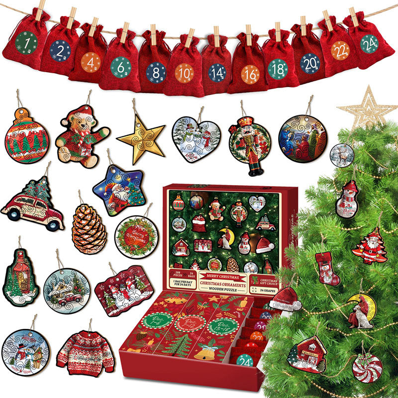 Paket: 24 Weihnachtsschmuck Holzrätsel +24 Taschen +24 Clips 📦🧩