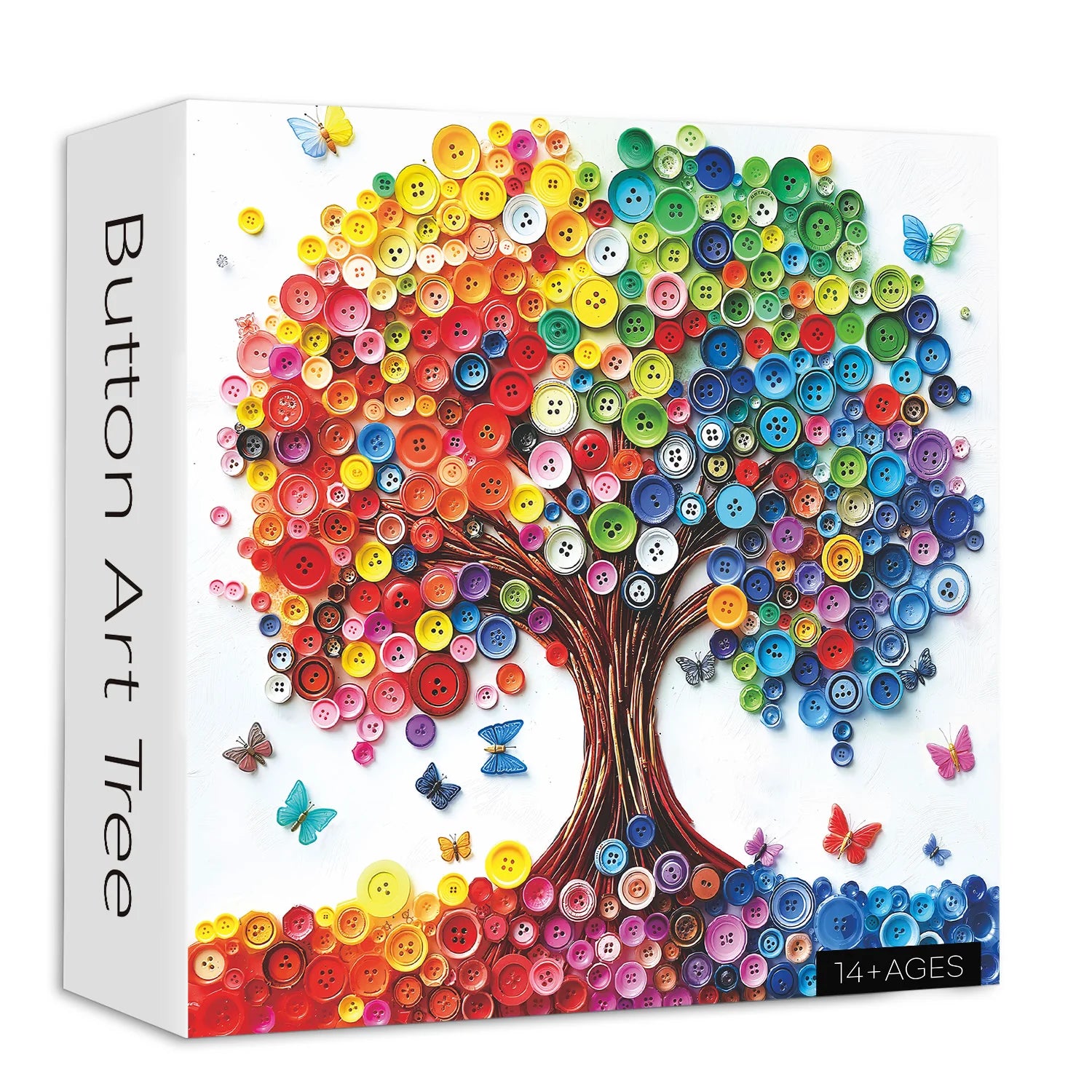 Design d'art à bouton unique Ramenez à la maison la beauté vibrante d'un arbre entièrement fait de boutons colorés et de papillons flottants, ajoutant du charme artistique à l'heure de votre puzzle.