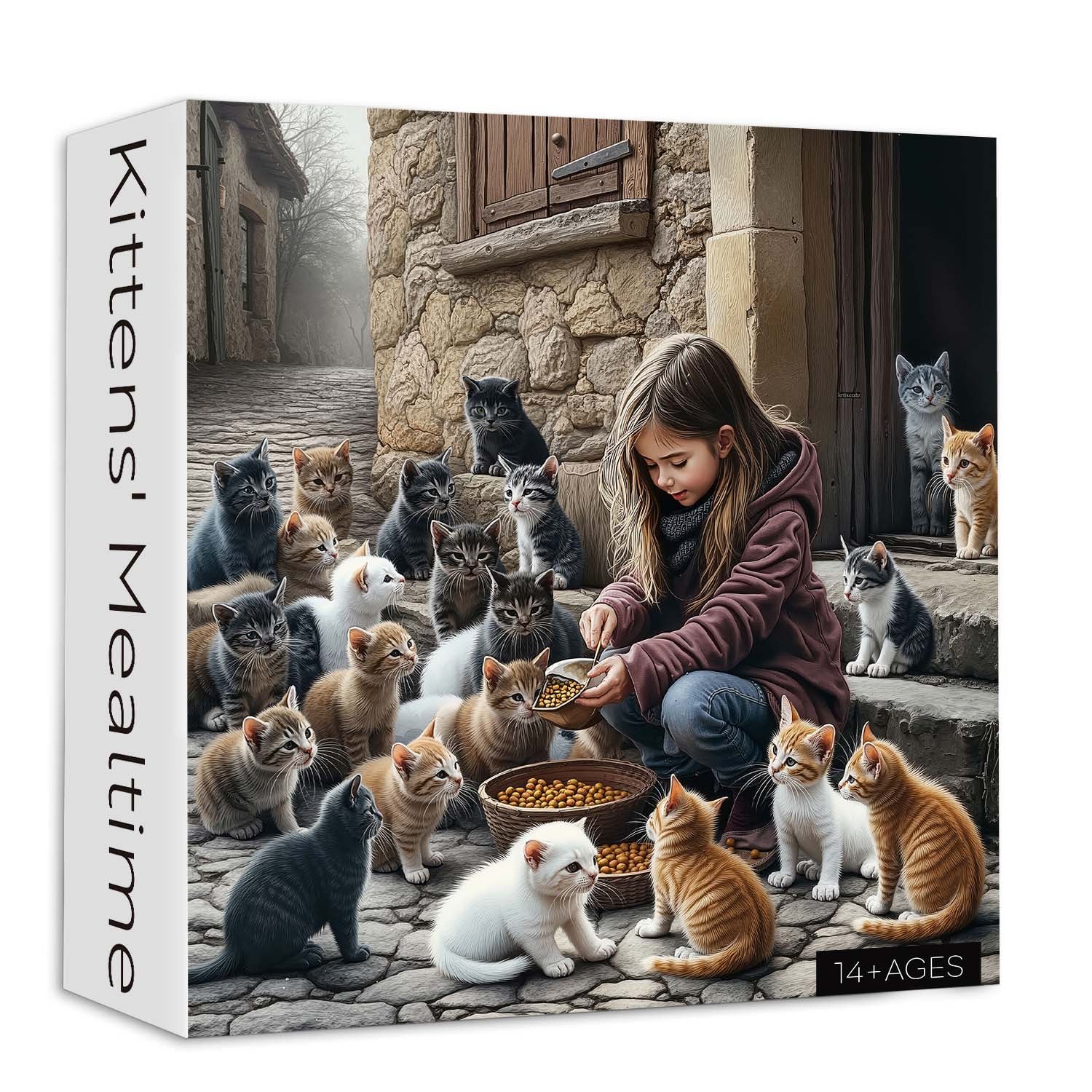 In a quiet alley, a kind girl is feeding a group of fluffy kittens as they gather around to enjoy their delicious meal 🍽️🐱.Some are gently sipping milk, while others curiously paw at the food bowls — such an adorable sight!🐾💖This puzzle captures the warmth and tenderness of the scene with soft colors and delicate brushstrokes 💖.Every piece you connect feels like listening to the gentle purring of these happy little kittens 🎶🐾