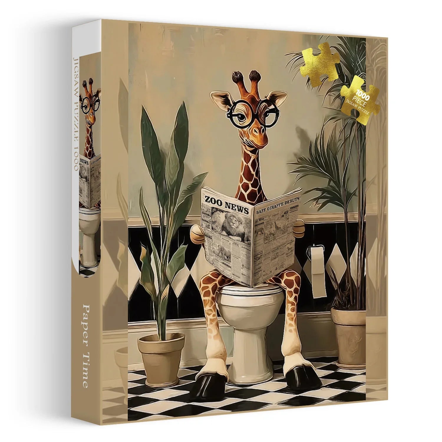 🦒【Paper Time】This puzzle features a giraffe wearing glasses, sitting on the toilet, intently reading a newspaper. The giraffe's expression is both focused and humorous, as if enjoying a quiet moment of reading.