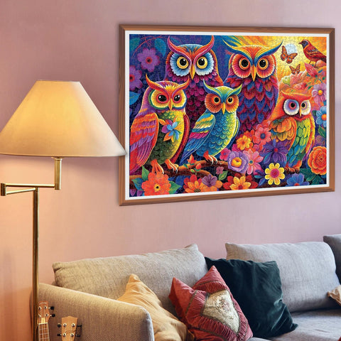 Welcome to the magical world of Whimsical Owl puzzles. Charming owls perch on colorful branches dotted with vibrant flowers, creating a dreamlike natural wonder.