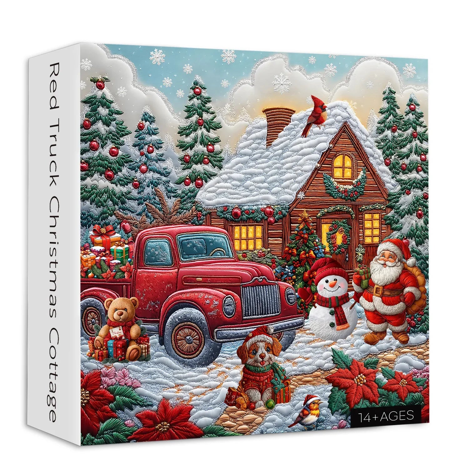 🎅Red Truck Christmas Cottage Jigsaw Puzzle:This puzzle depicts a heartwarming Christmas scene as Santa Claus heads to a cabin adorned with lights and garlands, ready to spread holiday cheer. A vintage red car, loaded with gifts, pulls up in front of the cabin, piled high with colorful boxes, adding to the festive atmosphere. A cheerful puppy and a loyal reindeer accompany Santa, adding warmth and energy to this festive tale.